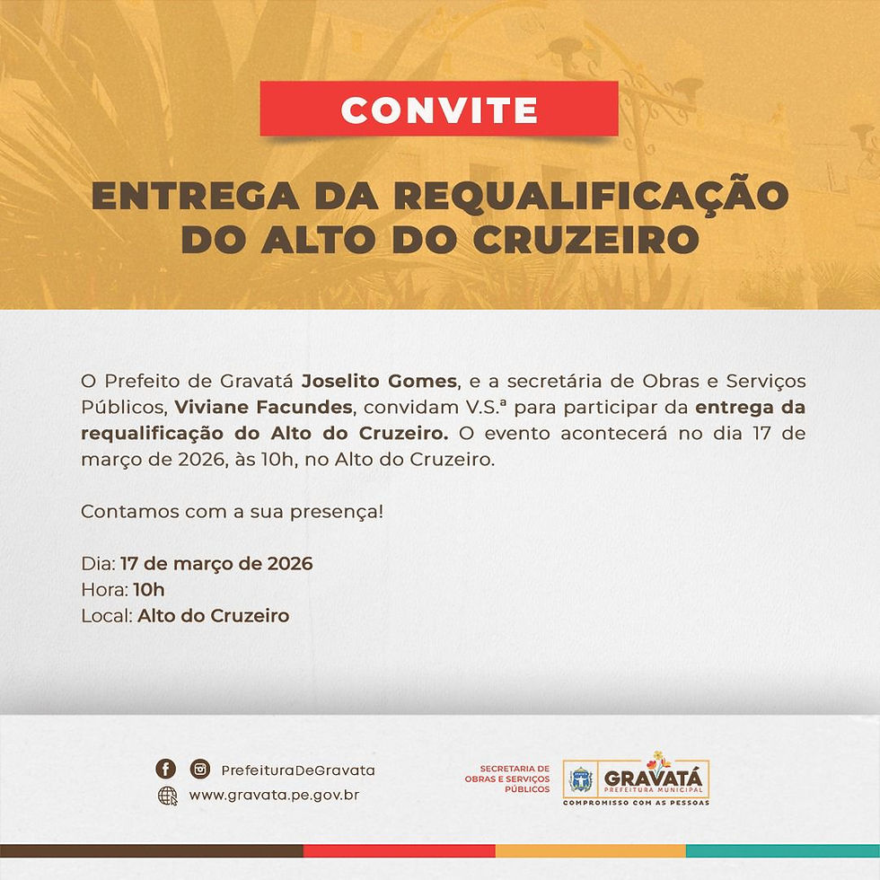 Reinauguração do Alto do Cruzeiro de Gravatá. Terça-feira, 17 de março, 10h. Aberto ao público.